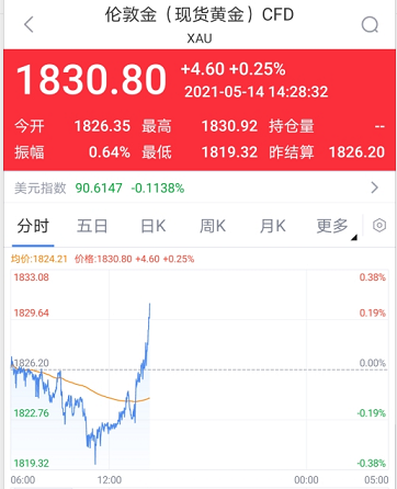 现货黄金上破1830美元/盎司,日内涨0.25%。