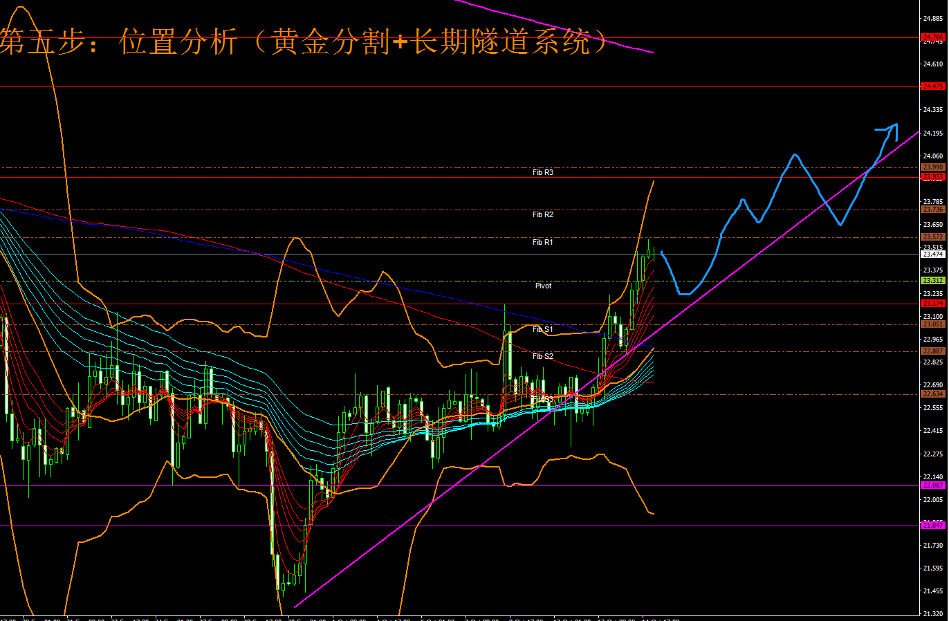 2、位置研判。黄金分割轴心点指标系统展示日内三大支撑分别为23.05-22.88-22.63,上方阻力为23.57-23.73-23.99.中轴23.31.今天银价将继续多头强势状态。