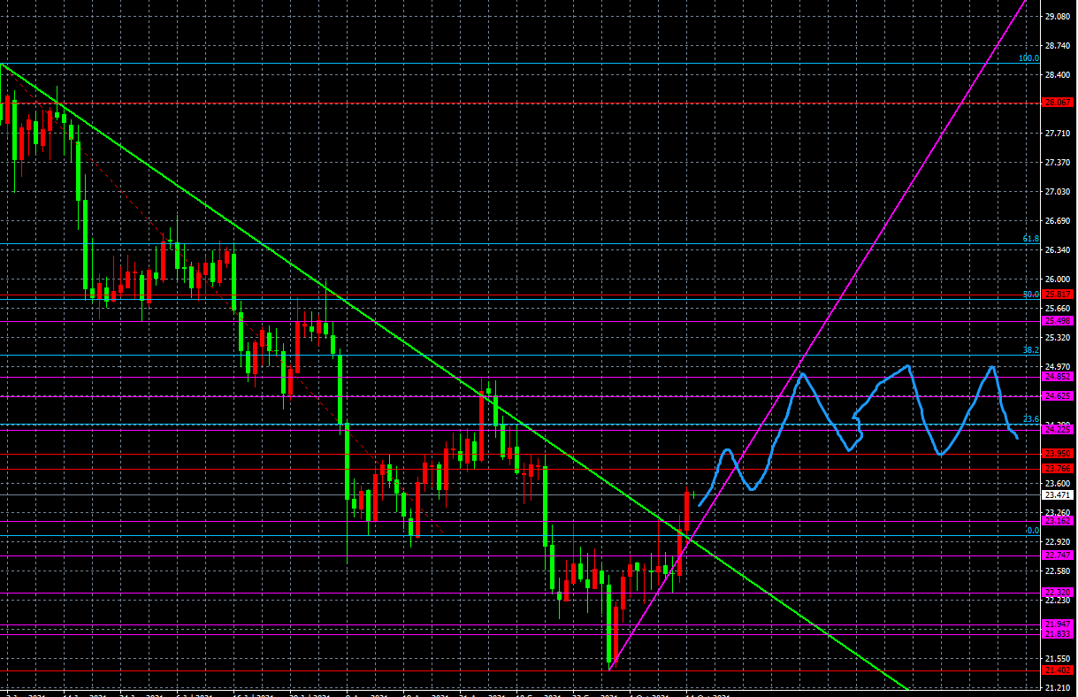 1、趋势分析。昨日白银终于走出了独立行情,在美元指数持续反弹,黄金滞涨的情况下,大幅突破上行,日k线收一根实体较长的阳线。连续两个交易日收实体大阳线,显示多头攻势正在加速启动,基本突破了过去数周以来的区间震荡局限,这预示着白银多头的真正回归。昨日白银ETF猛增230.35吨,说明主力机构开始着手介入白银市场。毕竟在大宗商品、能源等市场已经几番爆炒后,白银可能成为资本追逐的新猎场。短期而言,白银成功突破底部区间,并突破了6月以来的下跌趋势线,所形成多头攻势,至少要冲至9月高点24.80美元附近。不过,考虑到美联储11月议息会议的临近,预计多空最终在23.70-24.80区间展开激烈争夺。今日有望进一步上探24美元关口,试探空头阻力效果。