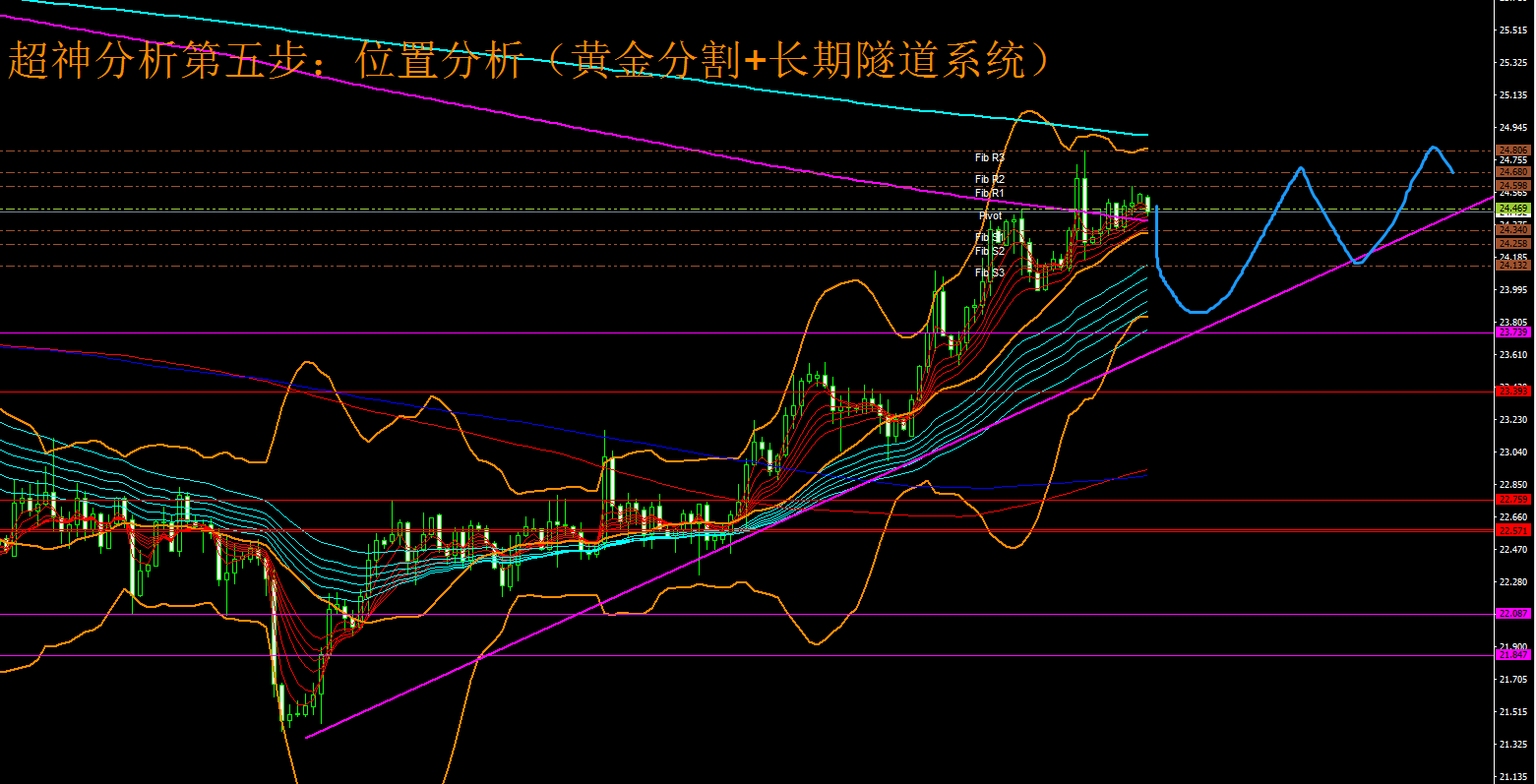2、位置研判。黄金分割轴心点指标系统展示日内三大支撑分别为24.34-24.25-24.13,上方阻力为24.59-24.68-24.80.中轴24.46。今日银价可能向S3一线寻求支撑。