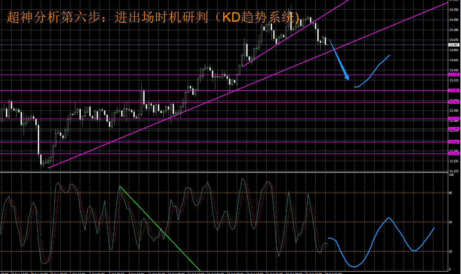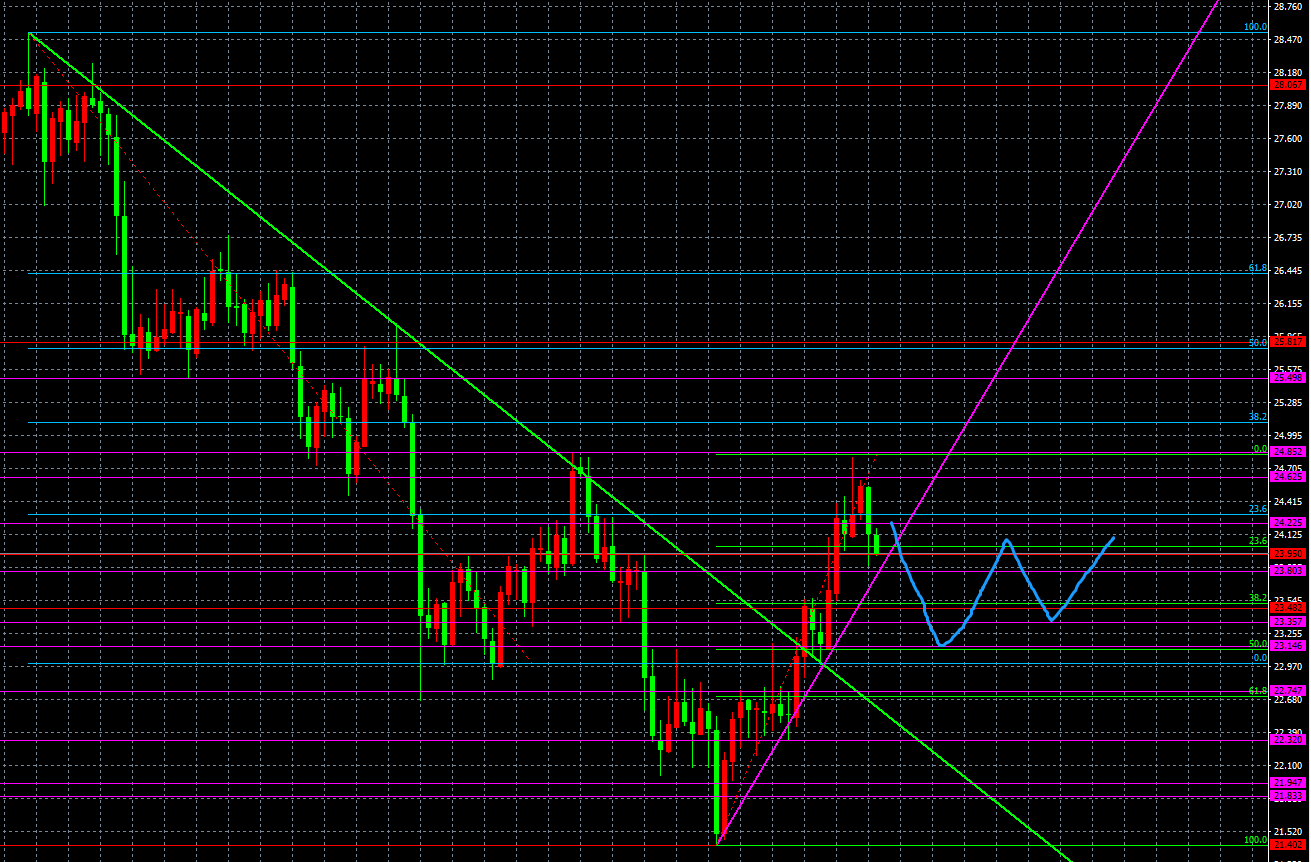 1、趋势分析。白银昨日大幅下跌,跌穿了过去三个交易日回升的低点,形成了短期的吞没形态,日k线收一根光头大阴线,显示了短期抛售的力度。符合我们最近的研判:底部回升的第一浪已经完成,行情进入次级调整行情阶段。根据黄金分割回调曲线测算,这波回调至少要抵达38.2%-50%区间(23.15-23.50区间),目前来看还有一定的回调空间。