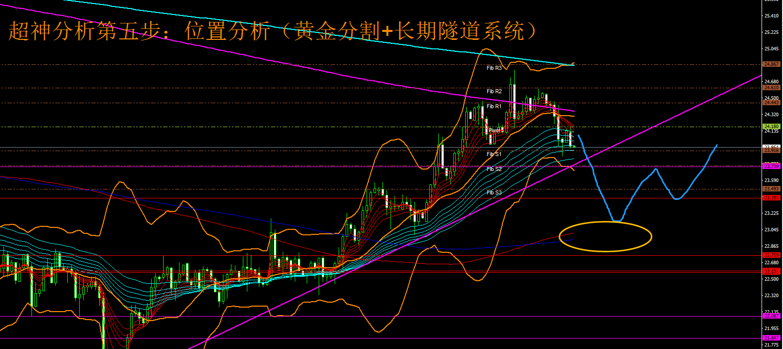 2、位置研判。黄金分割轴心点指标系统展示日内三大支撑分别为24.90-23.73-23.49,上方阻力为24.40-24.61-24.80.中轴24.18。今日银价继续向S3一线寻求支撑。