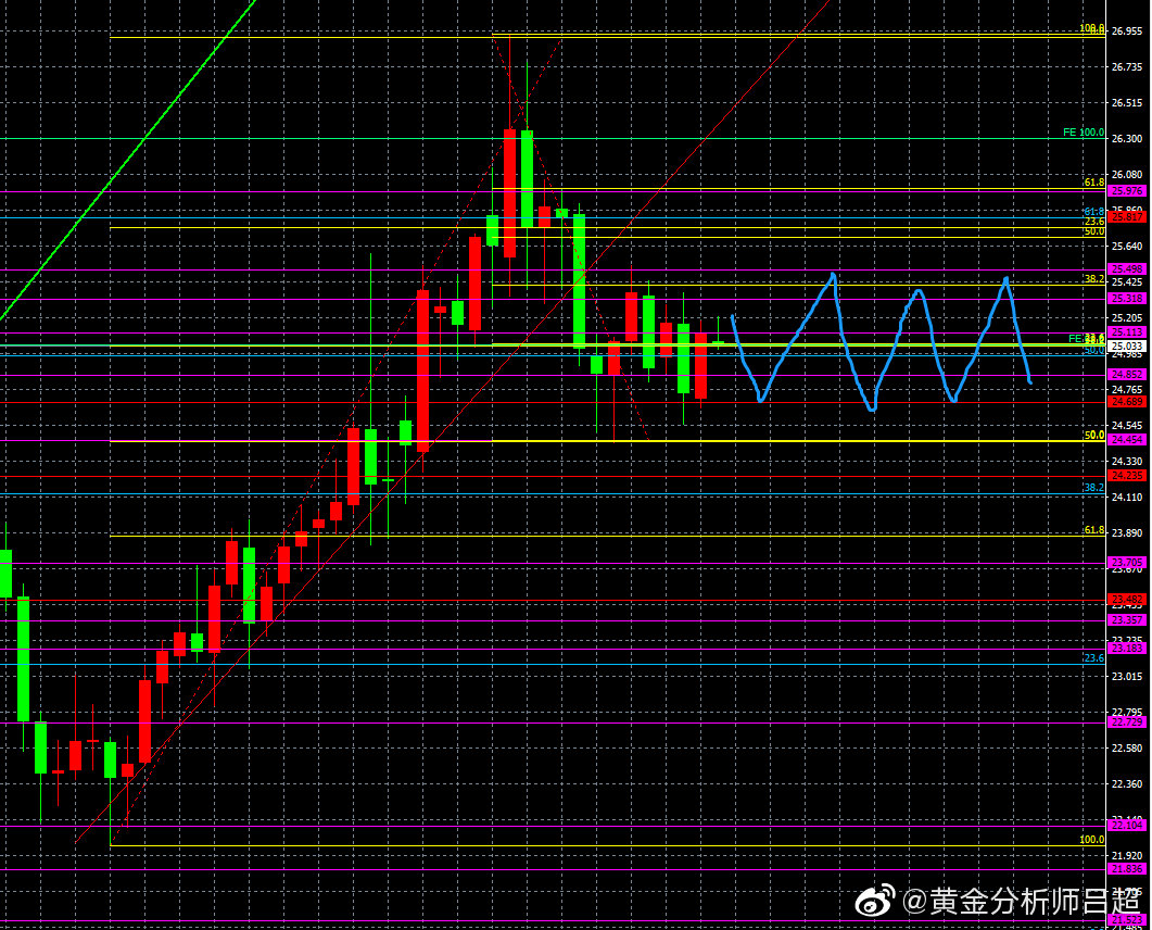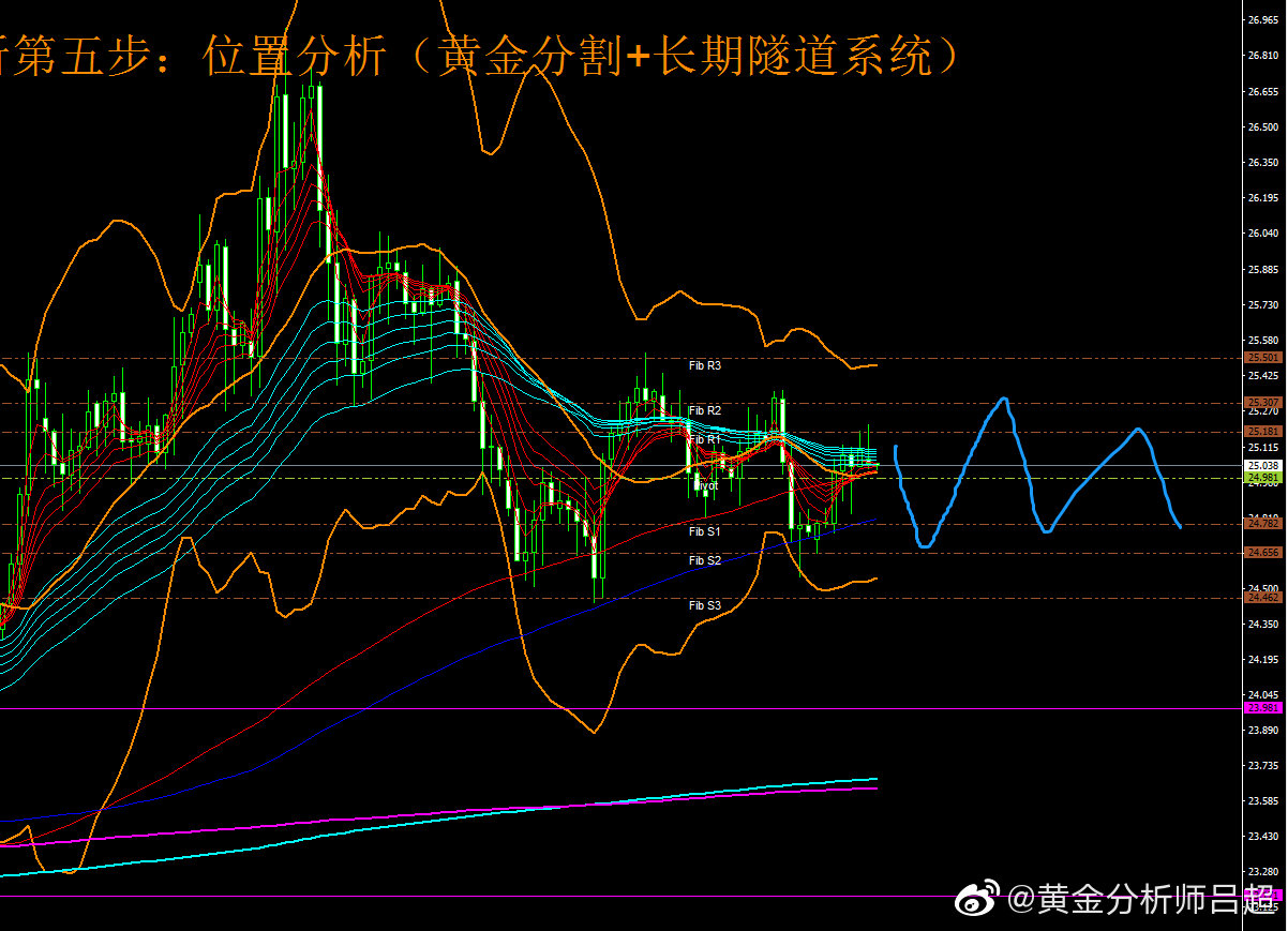 2、位置研判。黄金分割轴心点指标系统展示日内三大支撑分别为24.78-24.65-24.46,上方阻力为25.18-25.30-25.50.中轴24.98。预计银价今天在R2-S2区间震荡运行为主。