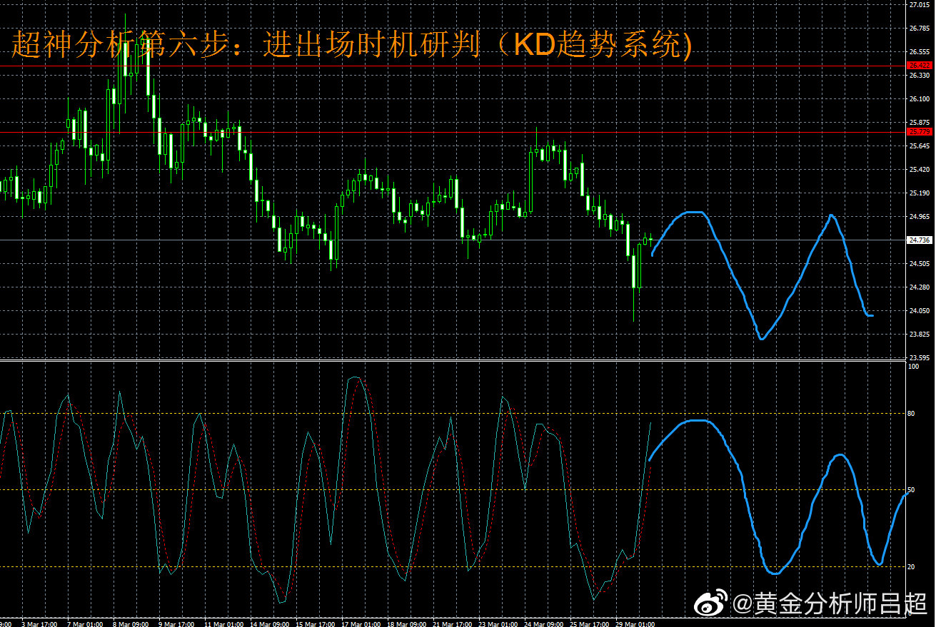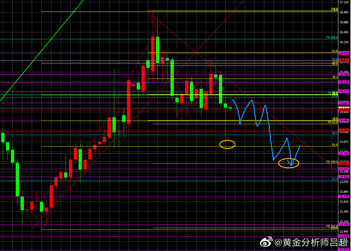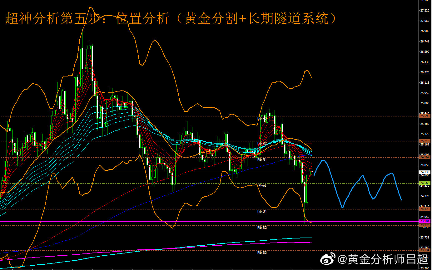 2、位置研判。黄金分割轴心点指标系统展示日内三大支撑分别为24.17-23.93-23.53,上方阻力为24.96-25.21-25.59.中轴24.56。预计银价今天反弹后还有第二次下探,随后在S1-R1区间震荡运行。