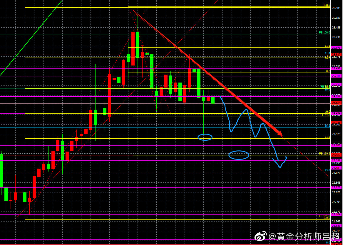 1、趋势分析。昨日白银维持了较强的反弹势头,探至25美元附近,但最终遭遇阻力而难以突破,表明上方空头压力明显,日k线收一根长上影的小阳线,显示两日反弹力量逐渐消化。而今天早间原油在美国预计释放过亿石油储备消息的刺激下,大幅下跌,迅速吞没两日涨幅。使得黄金和白银的反弹失去了支撑,白银迅速转向下跌,回吐了昨日的反弹幅度,有望继续向前低点下探。甚至有可能恢复空头趋势,继续下行。技术形态上,我们一直强调银价处于第三驱动浪行情中。这是一种稳定的中期趋势技术结构,不会轻易被短期的反弹破坏。