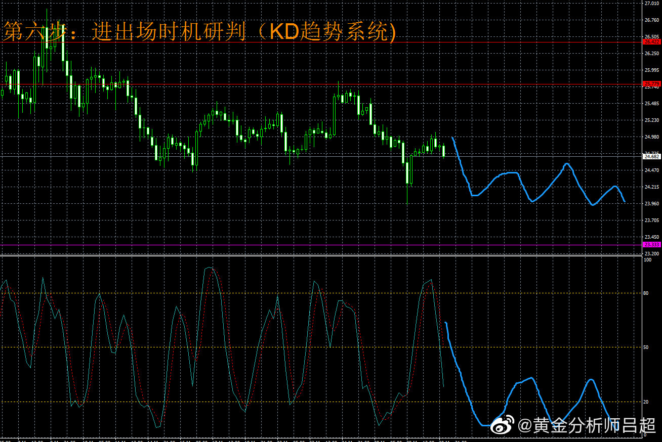 3.时机分析。4小时kd曲线昨日反弹至80刻度附近最终掉头向下,提前在25美元一线就预警了行情的转折,现在kd曲线正加速向20刻度方向下探,预示着银价有加速下探行情走势。