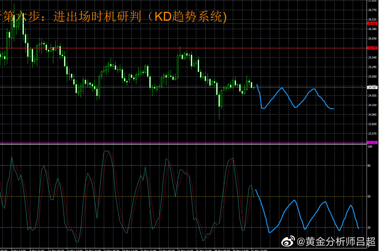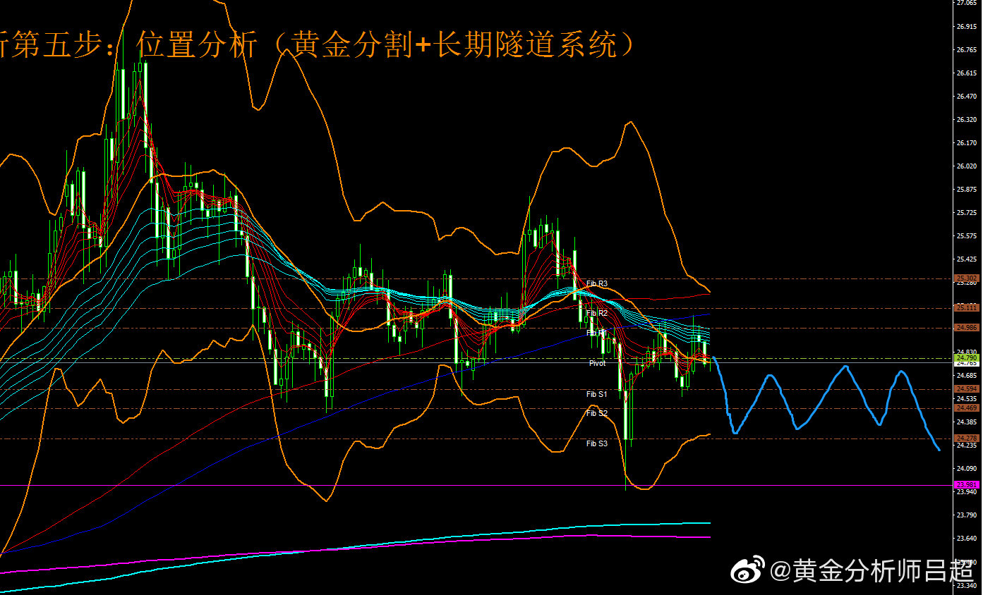2、位置研判。黄金分割轴心点指标系统展示日内三大支撑分别为24.59-24.46-24.27,上方阻力为24.98-25.11-25.30.中轴24.79。现在银价在中轴下方运行,表明空头压力偏重,预计银价今天继续向S3水平测试买盘支撑效果。