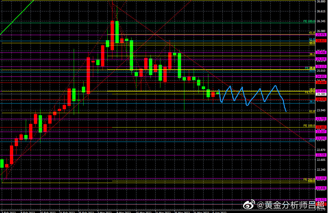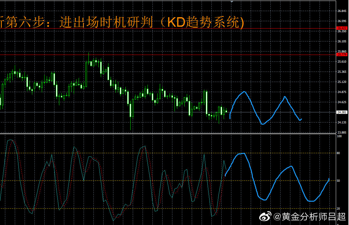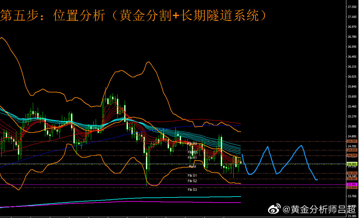 2、位置研判。黄金分割轴心点指标系统展示日内三大支撑分别为24.20-24.08-23.90,上方阻力为24.52-24.63-24.79.中轴24.36。现在银价在中轴附近徘徊,预计银价在R2-S3区间震荡运行。