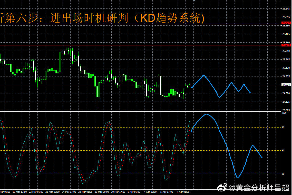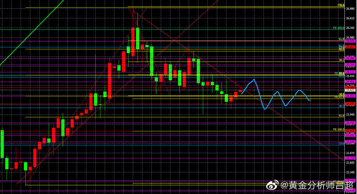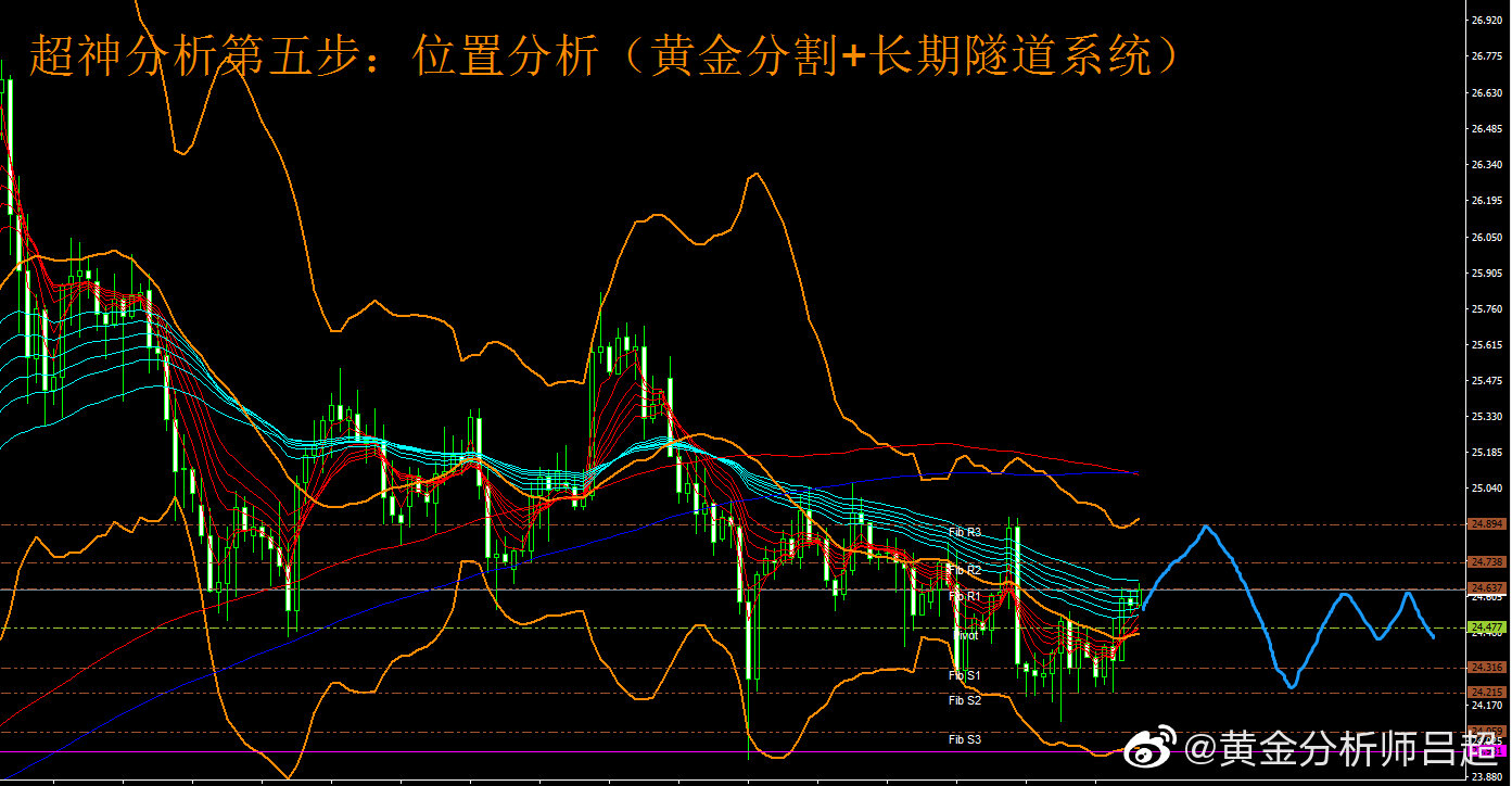 2、位置研判。黄金分割轴心点指标系统展示日内三大支撑分别为24.30-24.21-24.05,上方阻力为24.62-24.73-24.89.中轴24.47。现在银价在中轴上方,预计短期可能会进一步反弹至R3水平附近。四小时布林轨道开始走平,预示着行情转向震荡格局。预计银价在R3-S3区间震荡运行。