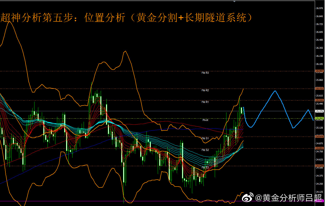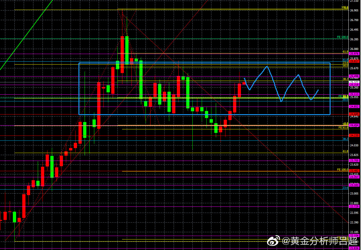 2、位置研判。黄金分割轴心点指标系统展示日内三大支撑分别为24.98-24.80-24.52,上方阻力为25.54-25.72-25.99.中轴25.26。现在四小时股比复合均线组合形成了短期多头的态势,但是目前价格远离布林轨道中轨,意味着银价还有回踩确认支撑的过程,银价的进一步上涨存在较大的压力。今日或在S1-R2区间震荡运行为主。