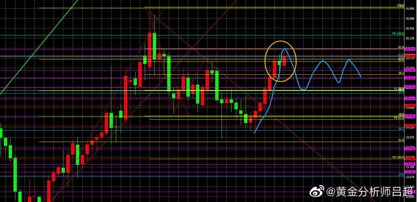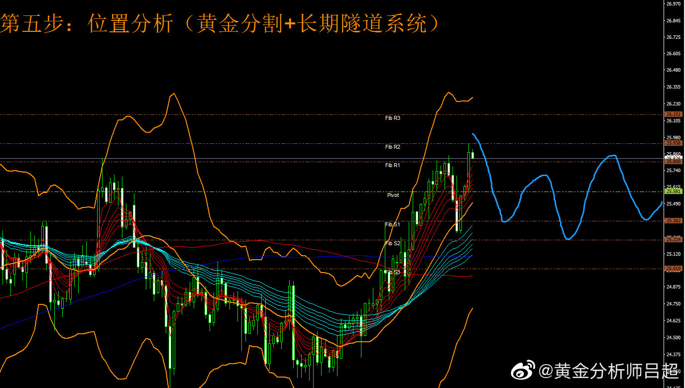 2、位置研判。黄金分割轴心点指标系统展示日内三大支撑分别为25.36-25.22-25.01,上方阻力为25.80-25.93-26.15.中轴25.58。今日银价探至了R2附近。我们注意到四小时布林轨道上轨开始走平,意味着调整需求。今日银价必然在R2-R3区间存在重大阻力,而下方则在S1S2区间有一定的支撑。
