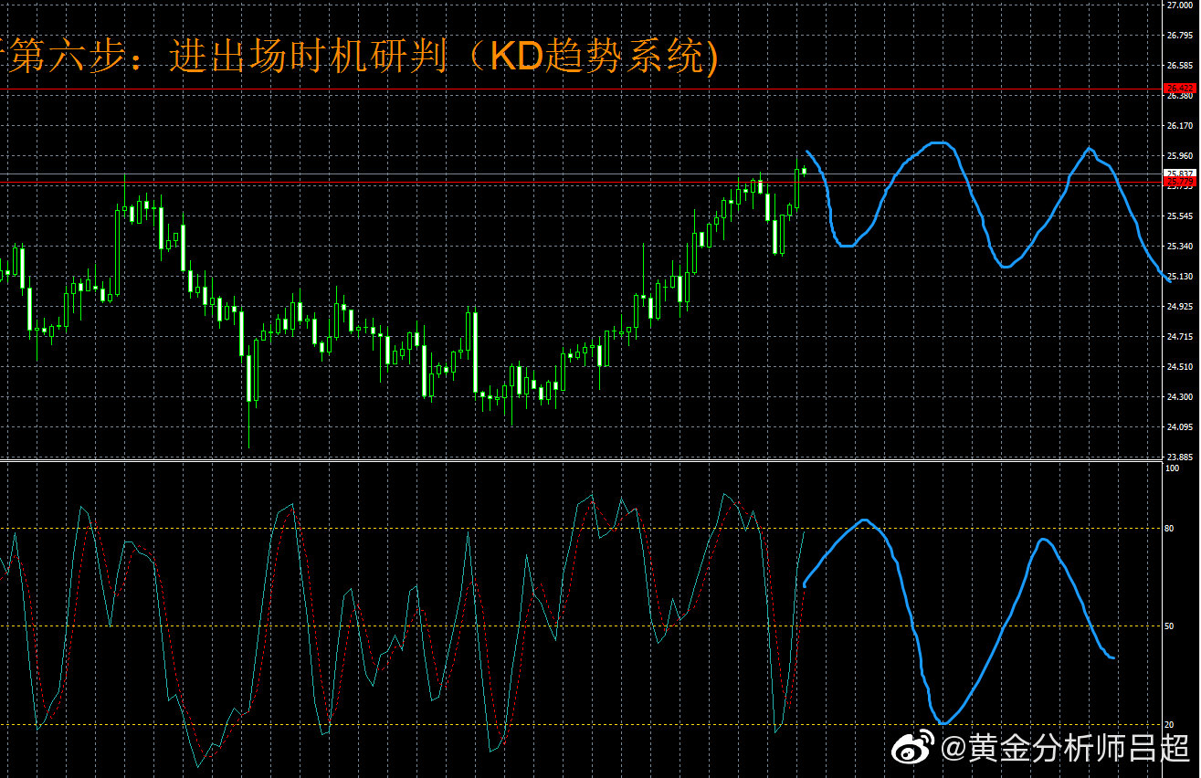 3.时机分析。4小时kd曲线快速拉升向80刻度附近,预计在该位置受阻后再度掉头回落至50刻度附近,提示银价的震荡格局。