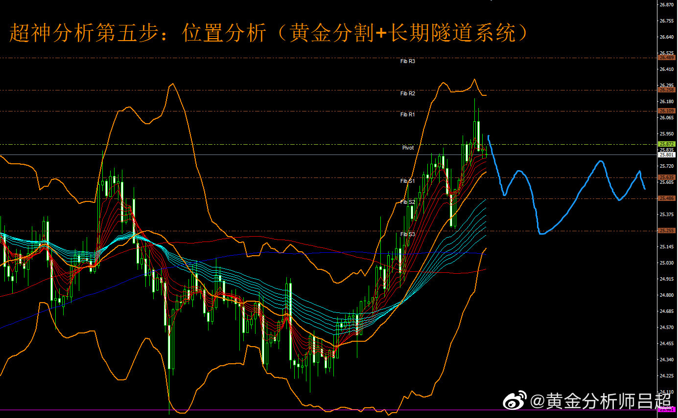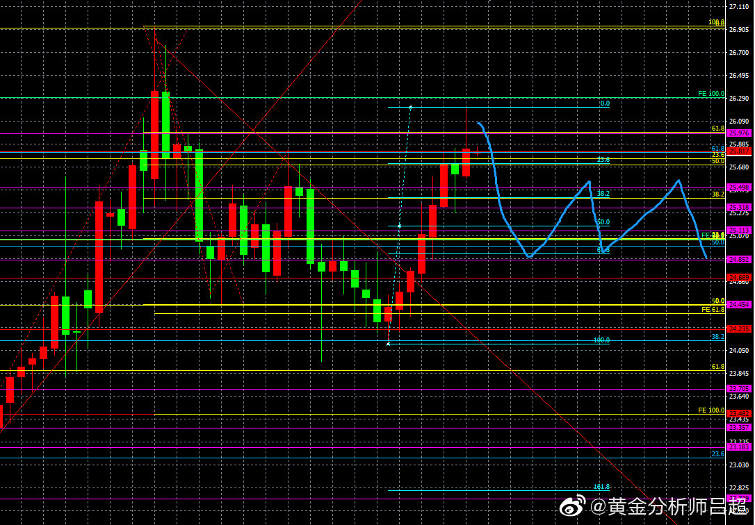2、位置研判。黄金分割轴心点指标系统展示日内三大支撑分别为25.63-25.48-25.25,上方阻力为26.10-26.25-26.48.中轴25.87。今日银价在中轴下方运行,预计有探至S3水平的较大可能。