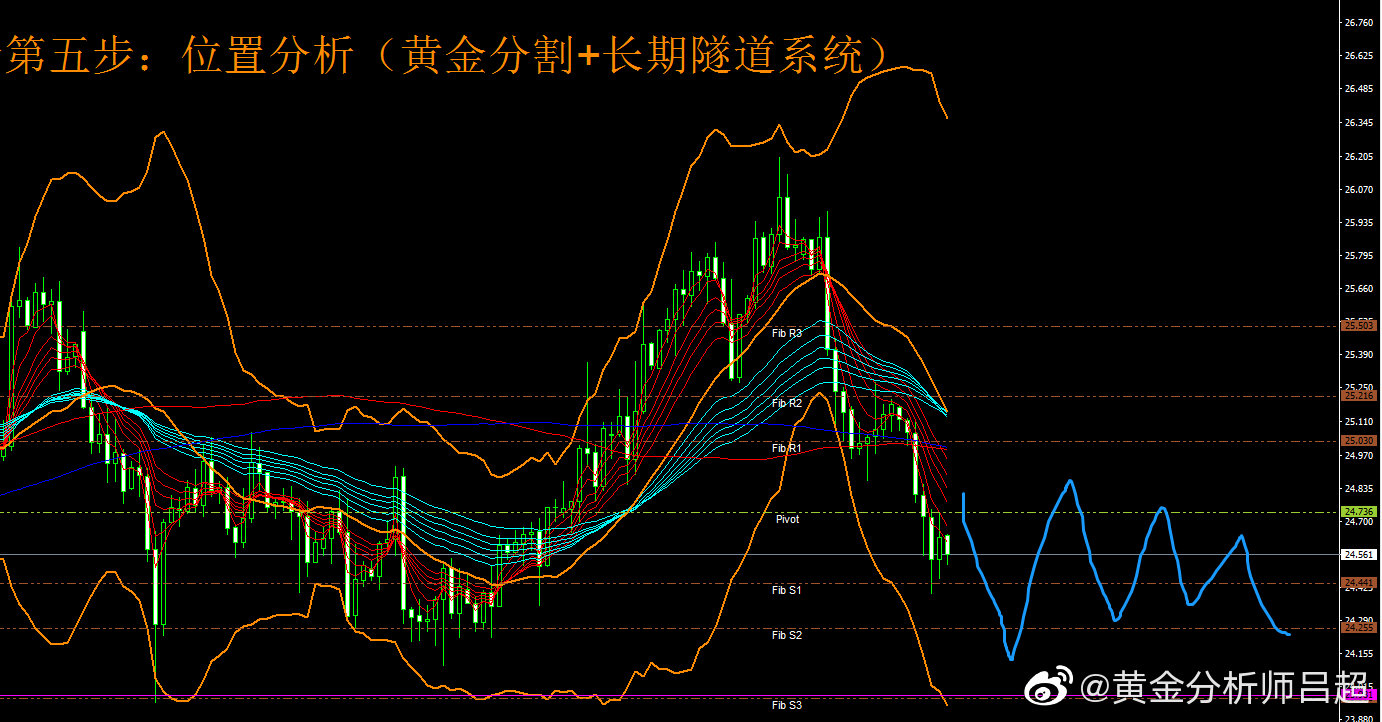2、位置研判。黄金分割轴心点指标系统展示日内三大支撑分别为24.44-24.25-23.98,上方阻力为25.03-25.21-25.50.中轴24.73。今日银价在中轴以下运行,预计银价在中轴和R1水平之间将面临重大压力。价格总体处于布林轨道下轨通道运行。