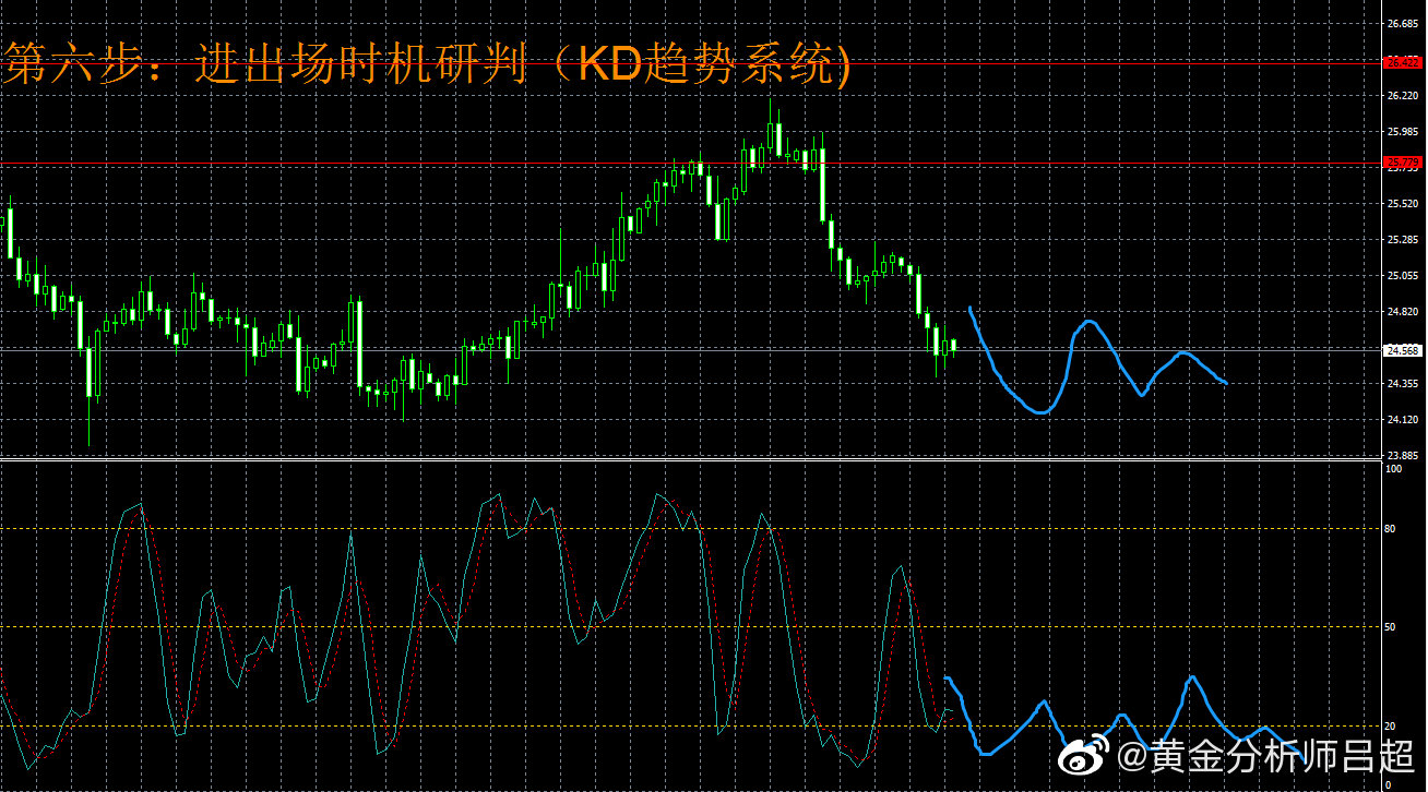 3.时机分析。4小时kd曲线昨日加速探至20刻度附近。今天预计在20刻度附近缠绕运行,显示银价的低位震荡盘整行情。
