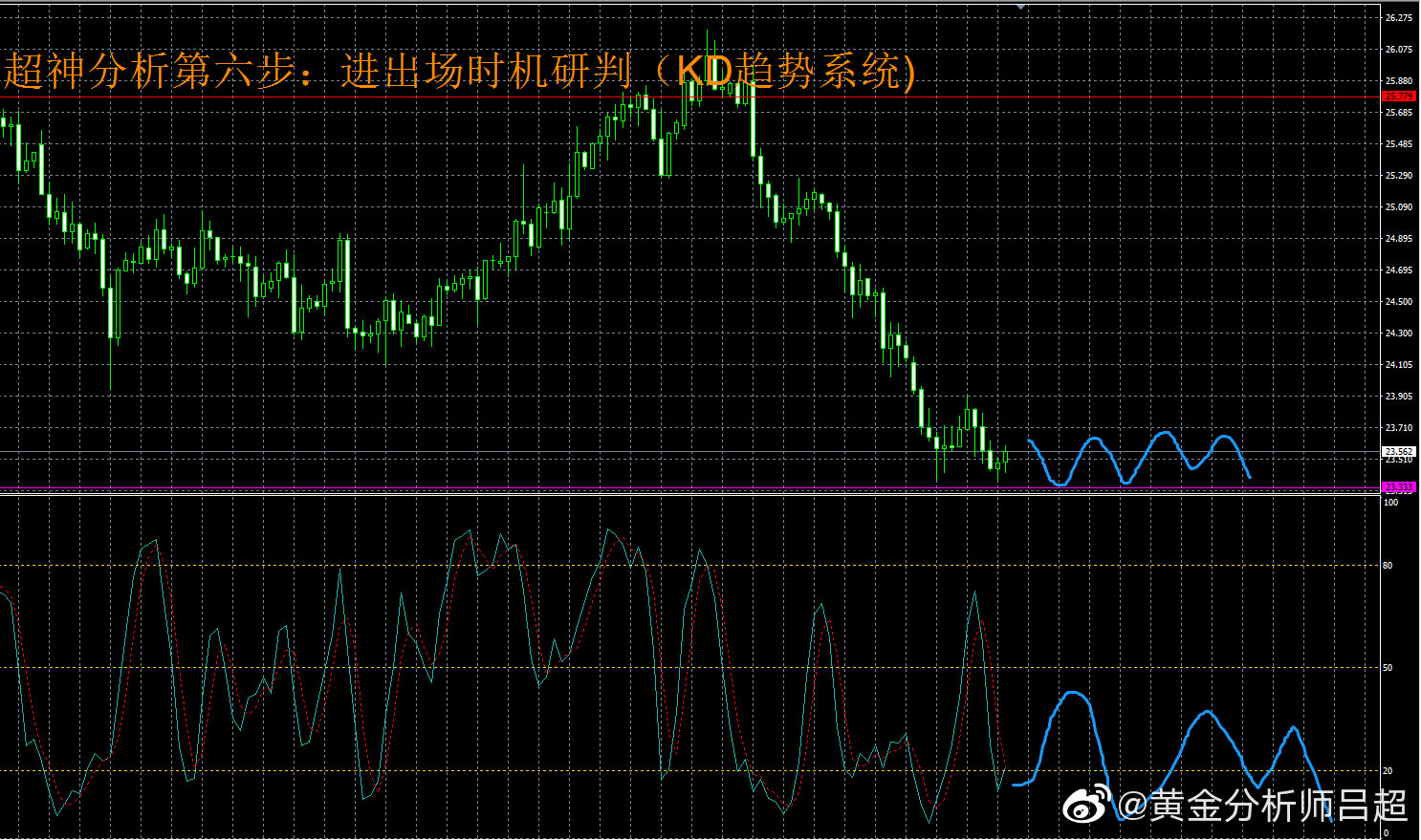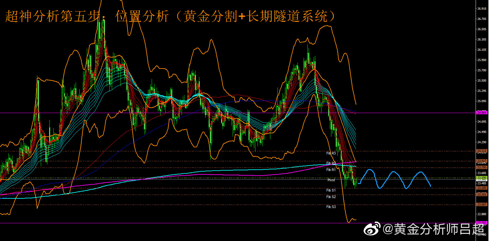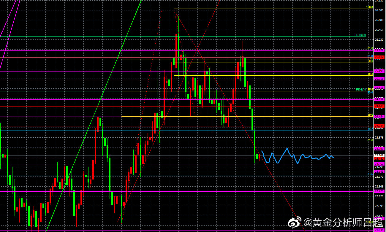 2、位置研判。黄金分割轴心点指标系统展示日内三大支撑分别为23.38-23.26-23.06,上方阻力为23.78-23.91-24.11.中轴23.59。四小时综合系统指标显示银价处于空头趋势运行中,跌穿了长期隧道,预示着银价还有更大的下跌空间,但短期可能存在调整修复的需求。