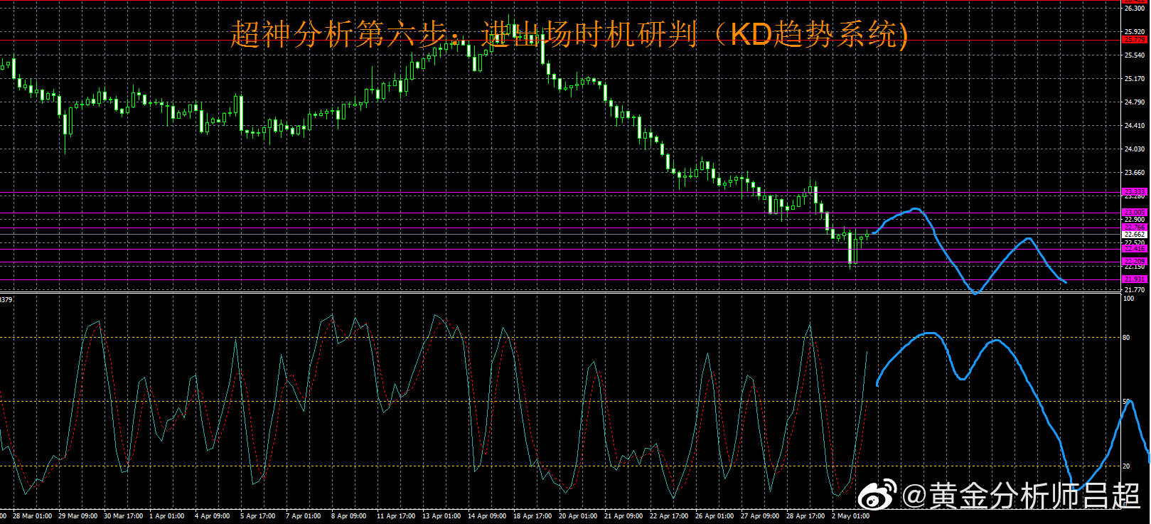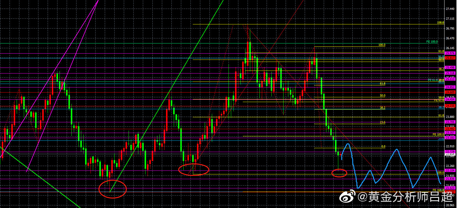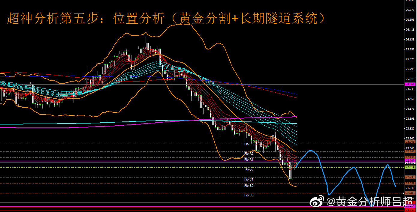 2、位置研判。黄金分割轴心点指标系统展示日内三大支撑分别为22.23-22.05-21.78,上方阻力为22.79-22.96-23.24.中轴22.51。四小时综合系统指标继续呈现空头的特征,有望在小幅反弹后继续走出单边下跌行情。
