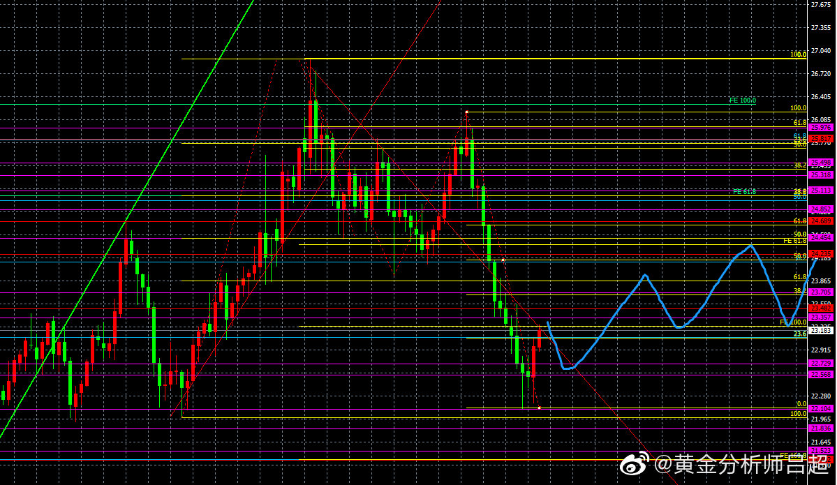 1、趋势分析。昨日银价二次下探后,大幅拉升,日k线收一根长下影的大阳线,覆盖了前两个交易日的阴线,形成了强烈的底部信号。这意味着银价急跌行情波段结束。我们以黄金分割回调曲线测算26.20-22.10美元区间,那么随着银价进入底部反弹回升的行情阶段,至少要向38.2%-50%水平回探,该位置在23.70-24.20美元区间。接下来,可以利用银价每一次回落的机会在22.30-22.80美元区间布局多头仓位。考虑到白银属于急跌急涨的属性。预计不会 经过太久的震荡运行,就会大幅拉升至50%水平附近。