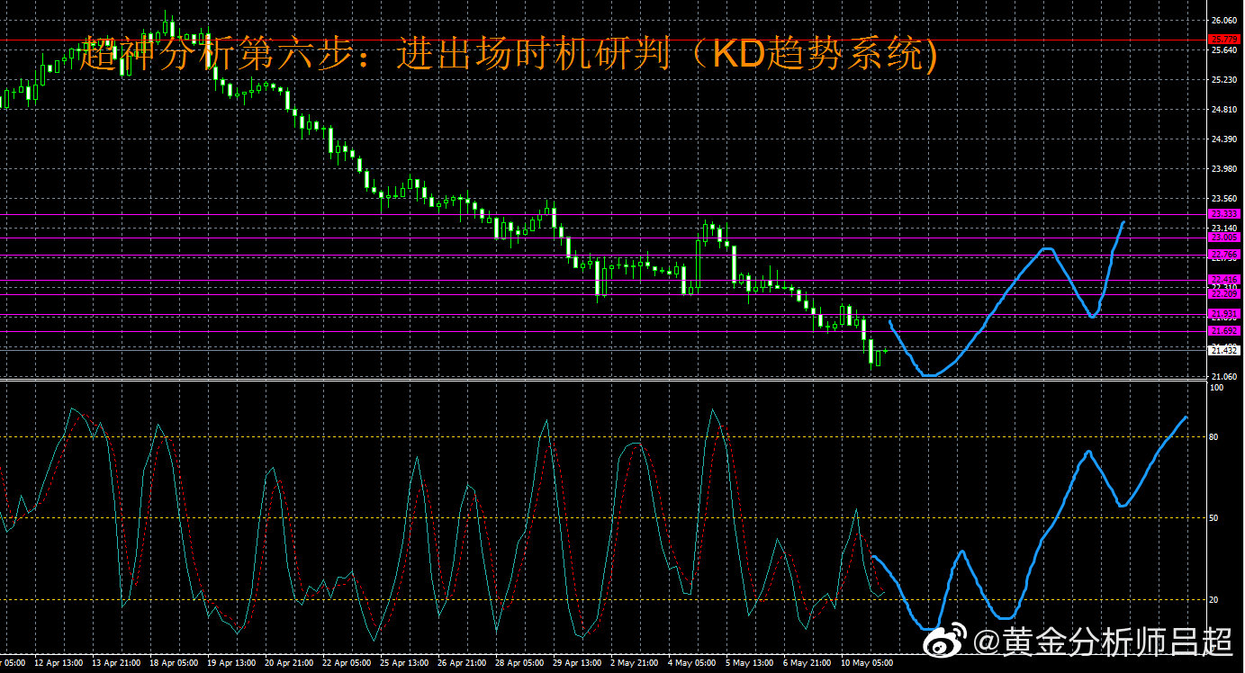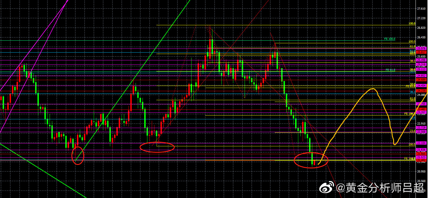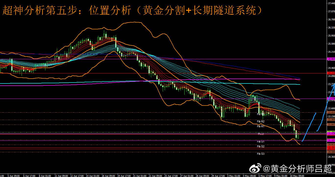 2、位置研判。黄金分割轴心点指标系统展示日内三大支撑分别为21.10-20.90-20.59,上方阻力为21.84-22.06-22.40.中轴21.50。四小时综合系统指标仍然处于空头特征,但是已经数极端空头状态,预计今日若下探布林轨道下轨,将有超低支撑效果,从而引发反向行情。