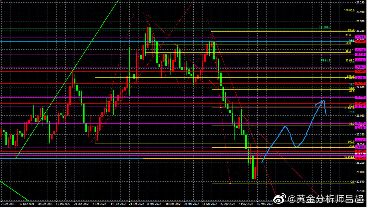 1、趋势分析。昨日白银以大涨收官,日k线收一根实体大阳线。录得连续第二个交易日大涨,完全突破了前一个大阴线。形成了底部回升的强化信号。现在银价重返21.40美元这一个两年大箱体震荡的低点附近。这是此轮单边四周大跌行情的结束的最明确信号。如果我们以黄金分割回调曲线测试26.20-20.40美元,50%水平再23.40美元一线。这就是此次见底反弹回升的首要目标。如果白银发生大幅逆转性的上涨,那也不足为奇。最近我们持续多日建议投资者在21美元以下以抄底做多为主。如果错过了,那么现在只能在21-21.50美元区间大胆进场了。