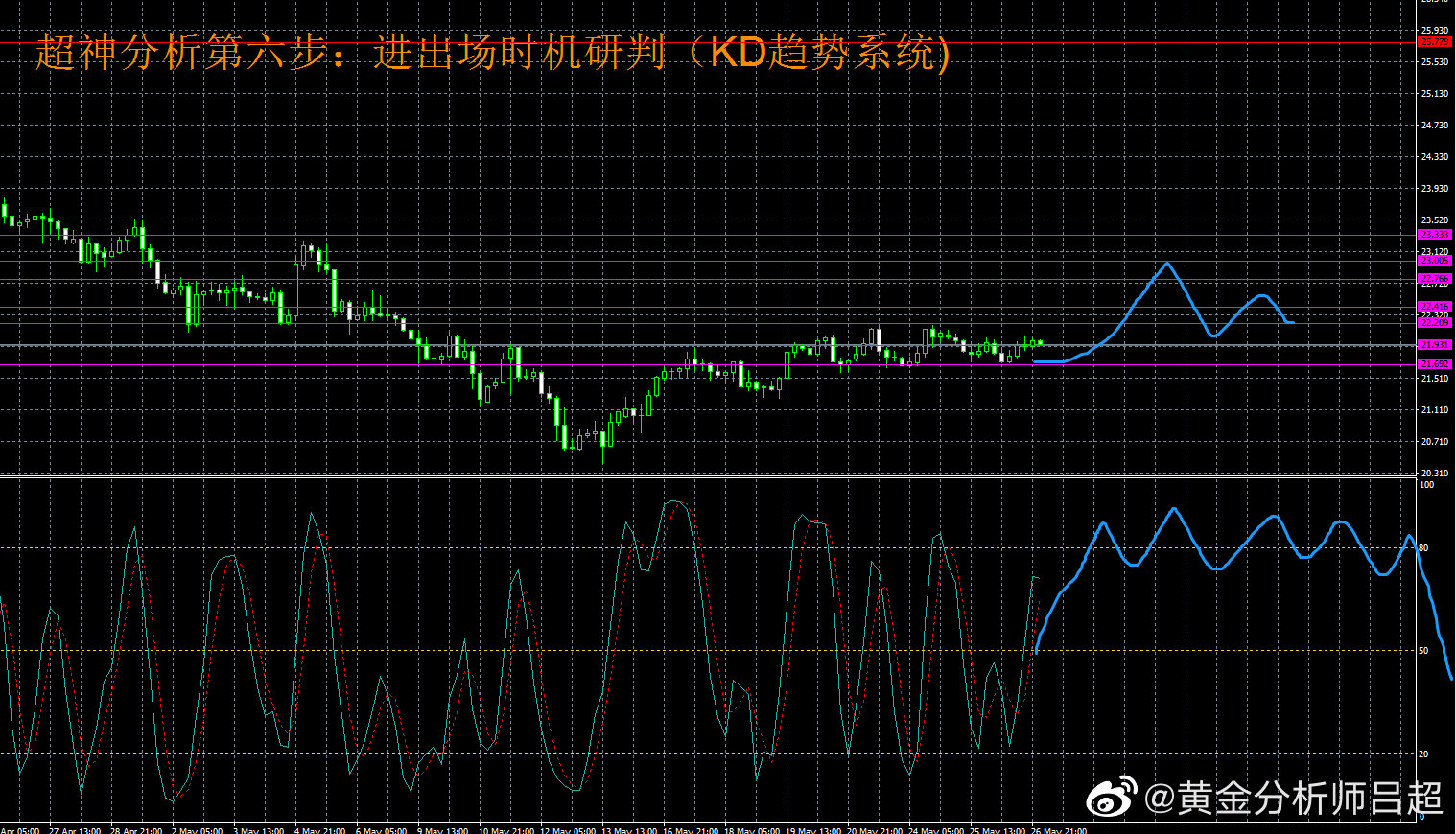 3.时机分析。4小时kd曲线昨日在20刻度获得支撑效果,现在处于回升状态,有望探至80刻度以上。银价一旦打破震荡格局,则有望展开长足的上涨。