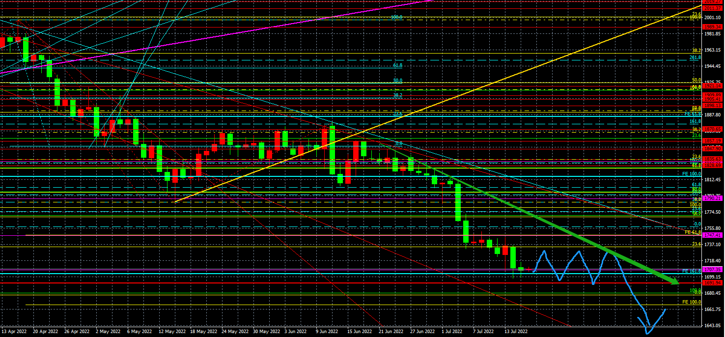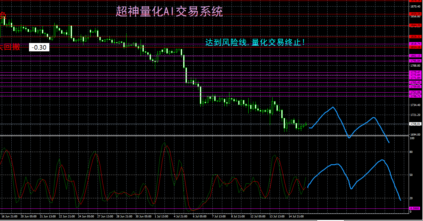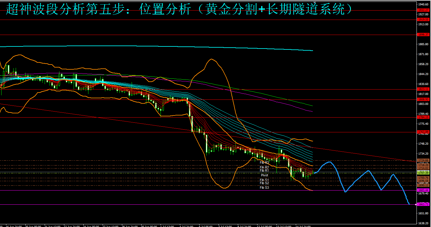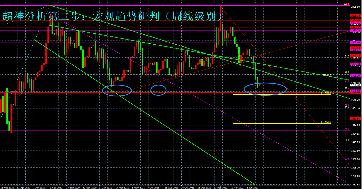 2、趋势分析:上周金价总体下跌,周k线线录得实体大阴线,并形成破位下跌的态势,连续五周下跌。目前金价距离两年低点1680美元仅仅一步之遥。是破位下跌,还是绝地反弹?市场留下了悬念。从技术形态和趋势的角度来看,在经历连续四个月单边下跌的趋势下,中期双顶形态已经完成了90%以上,仅剩劲线待破。显然破位下跌的想象空间远远大于反弹的空间。突破1680美元,意味着新一轮中期下跌趋势的启动。这是对美联储货币政策周期的适应。而从短期基本面角度,由于隔一周后,才迎来迎来美联储7月议息会议。又在两年低点附近,确实给了短期多头参与博弈的时间和幻想。但是无论在这个位置出现怎么样的反弹,我认为一旦进入美联储议息会议周,随时存在崩跌的风险。因此,从更加谨慎的角度,我们更倾向于认为本周可能短期出现一定的震荡行情,但是长期依然坚持以看空为主。特别是随着全球局势的变化,和美联储加息的力度不断加强,未来几周跌穿1680美元,打开新一轮中期空头趋势的可能性极大。